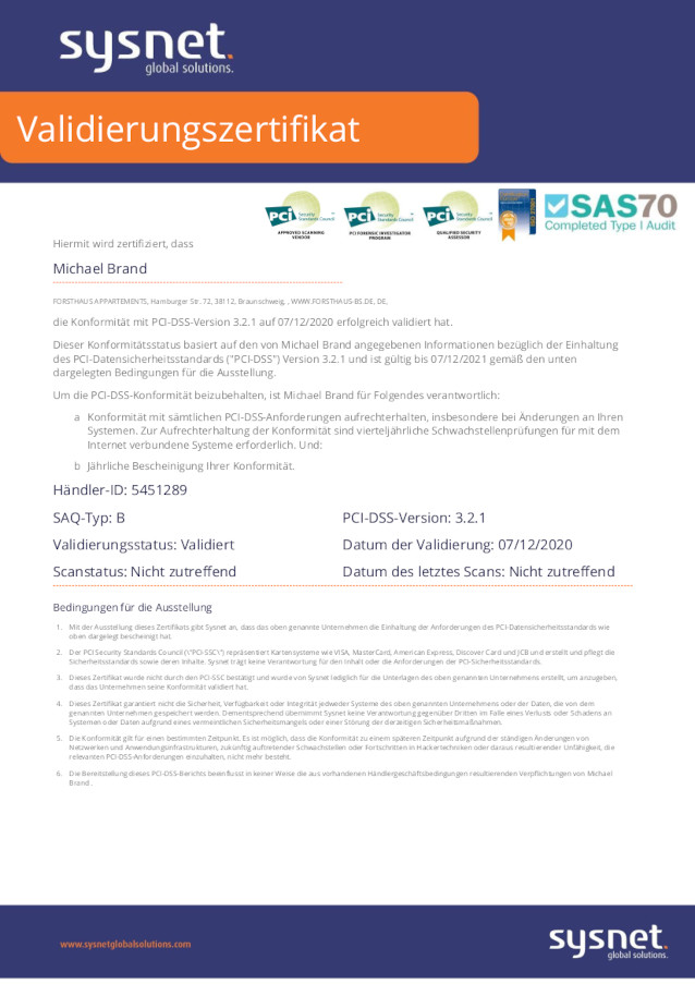Die Forsthaus Appartements haben den erfolgreichen Nachweis der Compliance nach Payment Card Industry Data Security Standard (PCI DSS) in der Version 3.2 erbracht. Das Unternehmen hat die folgenden Prüfungsmaßnahmen des PCI DSS erfolgreich absolviert: